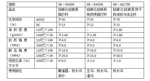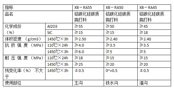產品用途及特點: 適用于中小型高爐出鐵溝以及大型高爐修補,具有施工性能好、強度大、不粘渣鐵、耐侵蝕、耐沖刷、高溫強度大等特點。理化指標見表一、表二。